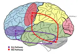 The M2 pathway is shown in red, originating in the pre-motor cortex. The PrL pathway is shown in purple, originating in the medial prefrontal cortex