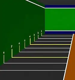 The falta line is located in the fourth square, while pasa is located in the seventh square; both lines are 15 cm wide. In the Olympic version, the falta is in the third square and the pasa on the fifth square.