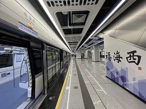 Fuhai West station (Chinese: 福海西; pinyin: Fúhǎi Xī; Jyutping: Fuk1 Hoi2 Sai1) is a metro station on Line 12 of Shenzhen Metro. It opened on 28 November 2022.[1][2] The station is located underneath the Guangzhou-Shenzhen intercity railway Viaduct, and is the first metro station in China to be built under a railway viaduct.[3]