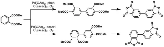 Ube Industries succeeded in an industrial application of the Fujiwara–Moritani reaction for the first time 1982.[7] In presence of a catalytic amount of palladium acetate, dimethyl phthalate was directly converted to a biaryl species that was then dehydrated to give biphthalic anhydride, a precursor of polyimide polymers. There are two different potential biaryl products, a symmetric or an asymmetric form. They achieved selective synthesis of either form via ligand control.[8][9]
