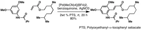 The Lipshutz group dramatically improved the conditions of the Fujiwara–Moritani reaction by developing reaction conditions that utilize water as the solvent and obviate the need for an exogenous acid.[17] Although the substrate scope is limited to p-methoxy aryl species, Lipshutz's report suggested that the Fujiwra-Moritani can be run under milder conditions.