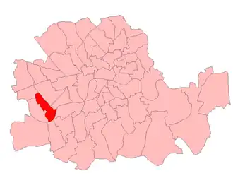 The Metropolitan Borough of Fulham wards of Barons Court, Lillie, Sands End, and Walham.
