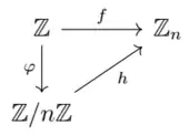 Diagram of the fundamental theorem on homomorphisms, where is a homomorphism, is a normal subgroup of and is the identity element of .