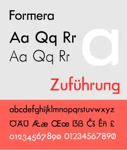 This free and open source typeface, originally called FuturaRenner, was digitized by Bastien Sozoo in 2011 while a student at La Cambre art school in Brussels.[49] The metal lead type in the letterpress facility of the school were given by Renner to Henry Van de Velde, the school's founder, and the original 1927 forms are, as Sozoo described it, "the first draft of Futura as we know it". While the capital letters are very similar to their modern counterparts (some visible differences include capital J's descent below the base line and a slightly higher crossbar on capital A), Formera uses text figures as opposed to the usual lining figures, and the letter forms of r (which has a distinctive dot-and-line styling), m and n (both of which are box-based and unrounded) are in particular contrast to modern Futura adaptations. Formera is available in light and regular weights, both of which are licensed under the SIL Open Font License.[50]