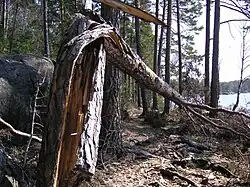 The narrow rift valleys running across the area are filled with either mud, which made them suitable for agriculture, or bogs. Notwithstanding the many traces of an old agricultural landscape dating back to the 17th century, large parts of the forest were felled more recently which makes most of the forest young. Several remains of charcoal stacks and windmills reminds of the three historical homesteads in the area where charcoal was being produced.[1]