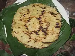 A güirila is a sweet type of tortilla made from young white maize.[1] They are usually eaten with crema (sweet or sour cream) and cuajada, a type of salty Nicaraguan crumbled white cheese.