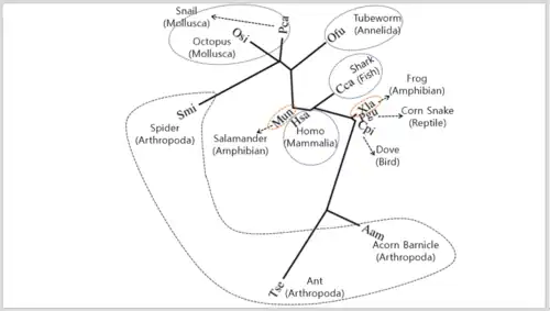 GPATCH2L evolves more slowly compared to Fibrinogen Alpha Chain but faster than Cytochrome C.[19] In the unrooted tree of GPATCH2L protein, only one mammal (human) is included since every species in mammals is very closely related to each other, showing various short lines. Arthropoda in invertebrates shows the longest line, meaning that they have diverged the longest.
