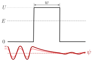 Top (black): Scheme of a energy barrier of height U as function of position. Bottom (red): Schrödinger wave-function with energy E.