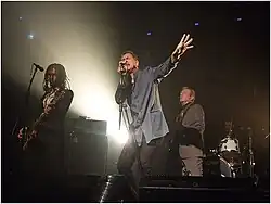 ![]() Gang of Four at the Bottom Lounge, Chicago, in 2022 L-R: Sara Lee, Hugo Burnham, Jon King, David Pajo | |