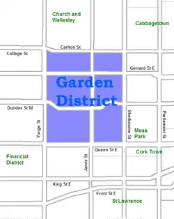 The Garden District is a neighbourhood in downtown Toronto, Ontario, Canada. The name was selected by the Toronto East Downtown Residents Association (TEDRA) in recognition of Allan Gardens, an indoor botanical garden located nearby at the intersection of Carlton and Jarvis Streets. The Garden District was officially designated by the Mayor and Toronto City Council in 2001, while TEDRA has since been renamed the Garden District Residents Association. Part of the neighbourhood is within official City of Toronto neighbourhood of Moss Park.