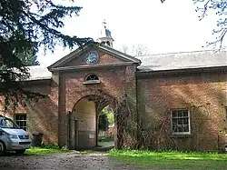 The brick Stable block, which has an entrance range with a central pediment over a lunette and surmounted by a cupola, is likely to be earlier than the main house.