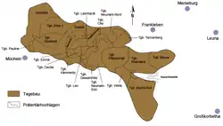 While plants and sometimes also invertebrates were found in all areas of the coal seams, vertebrates were bound to certain, more restricted sites. A total of more than 80 sites are known, 36 of which contain a significant number of vertebrate remains. These are mainly located in the Lower and Middle Coal, with around twice as many sites in the Middle Coal as in the Lower Coal. The upper coal contained only one relevant site and was otherwise largely fossil-free, which is partly due to the diagenetic changes during the Pleistocene under the influence of periglacial conditions.[9] No fossilization could be detected in the basal coal. The spatial distribution of vertebrate fossil sites reflects the conditions for the preservation of finds, which were not present to the same extent in the entire Geiseltal. As a result, the majority of vertebrate sites, especially those with complete skeletons or soft parts, are concentrated in the central and southern Geiseltal, mainly near the Neumark main sill and in the adjacent Wernsdorfer Kessel to the east. The majority of the sites are therefore located in the open-cast mines Cecilie, Leo, Geiselröhlitz and Pfännerhall and are spread over an area of around 20 km².[25] The quality of the fossil preservation decreases sharply to the north and west and partly to the east.[26][27]