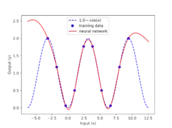 One application of machine learning is to perform regression from training data to build a correlation. In this example, deep learning generates a model from training data that is generated with the function . An artificial neural network with three layers is used for this example. The first layer is linear, the second layer has a hyperbolic tangent activation function, and the third layer is linear. The program produces parameter weights that minimize the sum of squared errors between the measured data points and the neural network predictions at those points. GEKKO uses gradient-based optimizers to determine the optimal weight values instead of standard methods such as backpropagation. The gradients are determined by automatic differentiation, similar to other popular packages. The problem is solved as a constrained optimization problem and is converged when the solver satisfies Karush–Kuhn–Tucker conditions. Using a gradient-based optimizer allows additional constraints that may be imposed with domain knowledge of the data or system.