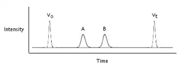 GPC chromatogram; Vo= no retention, Vt= complete retention, A and B = partial retention