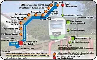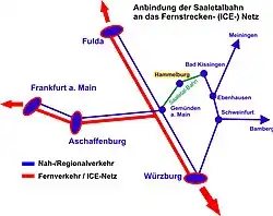 There are connections in Gemünden am Main to Schlüchtern, Aschaffenburg and Würzburg; and in Ebenhausen to Erfurt and Meiningen.