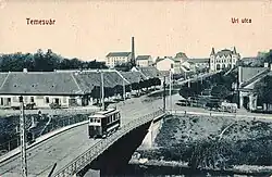 In 1890, a public tender was issued for replacing the wooden bridge, and the contract was granted to the Reșița Railway Company, led by engineer Henrik Reiber.[2] The Reiber family had constructed several significant buildings in the city, with the Dicasterial Palace being the most notable. However, due to bureaucratic delays, the bridge's construction was postponed. The steel bridge was ultimately finished in 1891, featuring a 30-meter opening, a 5.6-meter-wide roadway, and two pedestrian walkways, each 1.5 meters wide.[3] It was officially opened during the South Hungarian Industrial and Agricultural Exhibition held in Timișoara. With Emperor Franz Joseph in attendance, it was subsequently referred to as the Franz Joseph Bridge.[1]