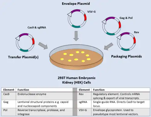 Targeted gene knockout using CRISPR/Cas9 requires the use of a delivery system to introduce the sgRNA and Cas9 into the cell. Although a number of different delivery systems are potentially available for CRISPR,[37][38] genome-wide loss-of-function screens are predominantly carried out using third generation lentiviral vectors.[35][39][40] These lentiviral vectors are able to efficiently transduce a broad range of cell types and stably integrate into the genome of dividing and non-dividing cells.[41][42] Third generation lentiviral particles are produced by co-transfecting 293T human embryonic kidney (HEK) cells with: