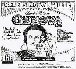 Genova is a 1953 Indian war romance film, directed by F. Nagoor and produced by E. P. Eppan.[1] The film stars M. G. Ramachandran, B. S. Saroja and P. S. Veerappa. It was filmed simultaneously in Malayalam and Tamil, with the Tamil version releasing two months after the Malayalam version.[2][3][4]