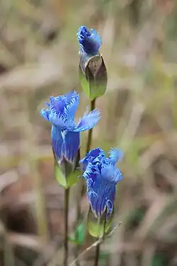 Gentianopsis crinita (sometimes called greater fringed gentian or blue gentian) is a biennial herbaceous species, native to eastern USA and eastern Canada.[1] The flowers of fringed gentian open on sunny days, but generally remain closed on cloudy days. Individual plants live for only one or two years; the plant is noted as having become relatively rare.[2] It grows in moist, limey woods, meadows, and stream banks.[3]