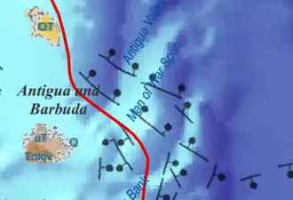 The geology of Antigua and Barbuda is part of the Lesser Antilles volcanic island arc. Both islands are the above water limestone "caps" of now inactive volcanoes. The two islands are the surface features of the undersea Barbuda Bank and have karst limestone landscapes.[1] Barbuda is primarily flat and formed from coral reefs. The Middle Miocene Highlands Formation has limestones which are the oldest rocks on the island, rising 120 feet above sea level. The Beazer Formation and the Codrington Formation are both from the Pleistocene and include reef and lagoon related rocks.[2]