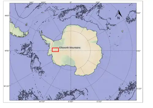 The geology of the Ellsworth Mountains, Antarctica, is a rock record of continuous deposition that occurred from the Cambrian to the Permian periods, with basic igneous volcanism and uplift occurring during the Middle to Late Cambrian epochs, deformation occurring in the Late Permian period or early Mesozoic era, and glacier formation occurring in the Cretaceous period and Cenozoic era.[1][2] The Ellsworth Mountains are located within West Antarctica at 79°S, 85°W. In general, it is made up of mostly rugged and angular peaks such as the Vinson Massif (16,050 feet or 4,890 metres),[3] the highest mountain in Antarctica.[2]