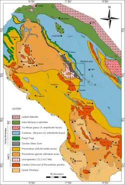 - Frank, W.; Gansser, A.; Trommsdorff, V. (1977). "Geological observations in the Ladakh area (Himalayas); a preliminary report". Schweizerische Mineralogische und Petrographische Mitteilungen Bulletin. 57 (1): 89–113.