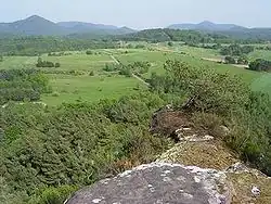 Typical Wasgau landscape with flattened areas and conical hills: View from Lindelbrunn to Rehberg (in the center of the picture)