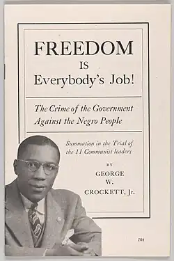 In 1948, Crockett became a member of the legal team that went to New York for the Foley Square trial to defend 11 Communist Party leaders accused of teaching the overthrow of the Federal government, a violation of the Smith Act. Among the 11 were Communist Party leaders: Gil Green, Eugene Dennis, Henry Winston, John Gates, Gus Hall, Robert G. Thompson and fellow Morehouse alumnus and first black New York City Councilman Benjamin J. Davis. In 1949, while defending the Smith Act prosecution, Crockett and four other defense attorneys were sentenced by Judge Harold Medina to Federal prison for contempt of court. Crockett served four months in an Ashland, Kentucky Federal prison in 1952.[7] A portion of Crockett's jury summation at the trial was published in Freedom is Everybody's Job! The Crime of the Government Against the Negro People.