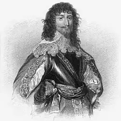 Notwithstanding his father's differences with the government, the second Marquess found himself in the enjoyment of the royal favour. He had been educated at court along with Prince Henry and Prince Charles; and as a Protestant episcopalian he was naturally relied on to render the utmost assistance to the government in their policy towards the covenanters. His supreme influence in the north served to balance that of Archibald Campbell, 1st Marquess of Argyll in the west.[6] In 1638 he caused the royal proclamation to be read at the New Aberdeen's mercat cross. At the beginning of the dispute with the king the covenanters sent to him Colonel Robert Munro as their ambassador, offering, if he would cast in his lot with them, not only to make him their leader, but to pay all his debts, which were said to amount to £100,000 sterling. But "to this proposition," says Gordon, "Huntly pave a short and resolute repartee, that his family had risen and stood by the kings of Scotland, and for his part, if the event proved the ruin of the king, he was resolved to lay his life, honours, and estate under the rubbish of the king his ruins". He therefore not only refused to subscribe the covenant, but in September, alone of the other noblemen appointed in the north, accepted the commission of the king to cause the people to subscribe the king's covenant and band.[5]