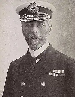 He was appointed in command of the HMS Australia, coast guard ship for Southampton Water, on 20 January 1900,[3] serving as such until 23 November 1902. Australia escorted the royal yacht HMY Osborne when Queen Victoria visited Ireland in April 1900,[4] and in September the following year she visited Germany and Denmark when she escorted the royal yacht carrying King Edward VII from Hamburg to Elsinore.[5] For his service to the King during the 1901 tour, he was appointed a Member (fourth class) of the Royal Victorian Order (MVO) in October 1901.[6] He also commanded her for the fleet review held at Spithead on 16 August 1902 for the coronation of King Edward VII.[7]