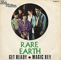 The rock band Rare Earth regularly played "Get Ready" in concert, where it was a popular staple of their live performances, and recorded a version for their 1968 Verve release, Dreams/Answers.[5] After signing with Motown, executive Barney Ales asked the band to re-record the song for their first release on Motown's then-unnamed rock subsidiary, due to the audience response to the band's cover.[5] After recording a version which was scrapped, the band themselves set up their own recording equipment and recorded a 21-minute version, which later had audience applause dubbed in.[5] The new recording of "Get Ready" was edited down to 2:46 for a single, which was given a Tamla Motown release in the UK, the only release by the band to appear on Motown itself, and unlike the Temptations' version, Rare Earth's recording was a success on the pop chart.[5] The single peaked at #4 on the Billboard Hot 100 chart in 1970.[6] The Rare Earth version of the song also peaked at number twenty on the R&B chart.[7]