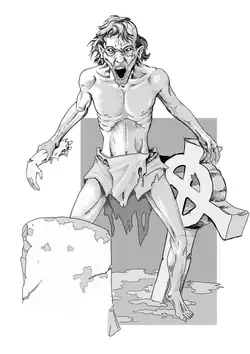 A ghoul is a mythical creature originating in pre-Islamic Arabia, often described as hideous human-like monster that dwelt in the desert or other secluded locations in order to lure travellers astray. It was not until Antoine Galland translated the Arabian Nights into French that the western idea of ghoul was introduced. Galland depicted the ghoul as a monstrous creature that dwelled in cemeteries, feasting upon corpses. This definition of the ghoul has persisted until modern times, with ghouls appearing in literature, television and film, as well video games.[1]