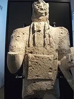The Giants of Mont'e Prama (Italian: Giganti di Mont'e Prama; Sardinian: Zigantes de Mont'e Prama[1] [dziˈɣantɛz ˈmɔntɛ ˈβɾama]) are ancient stone sculptures created by the Nuragic civilization of Sardinia, Italy. Fragmented into numerous pieces, they were discovered in March 1974 on farmland near Mont'e Prama, in the comune of Cabras, province of Oristano, in central-western Sardinia. The statues are carved in local sandstone and their height varies between 2 and 2.5 meters.[2]
