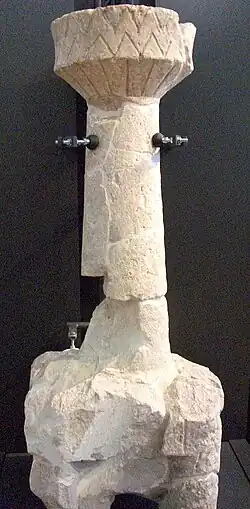 Still in the time-frame of the Prenuragic age, but in this case during the Eneolithic period, there is a remarkable production of "Laconi-type" statue-menhirs or statue-stelae, assigned to the Abealzu-Filigosa culture and characterized by a uniform tripartite scheme encompassing, from top to bottom: a stylized T-shaped human face; the depiction of the enigmatic capovolto (the capsized) in the kind of trident capovolto; and a double-headed dagger in relief.[11][20]