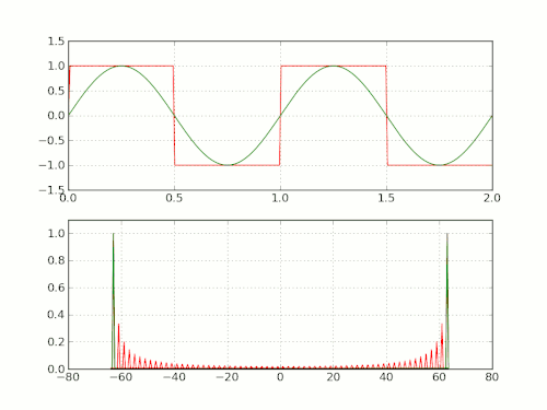 From a signal processing point of view, the Gibbs phenomenon is the step response of a low-pass filter, and the oscillations are called ringing or ringing artifacts. Truncating the Fourier transform of a signal on the real line, or the Fourier series of a periodic signal (equivalently, a signal on the circle), corresponds to filtering out the higher frequencies with an ideal (brick-wall) low-pass filter. This can be represented as convolution of the original signal with the impulse response of the filter (also known as the kernel), which is the sinc function. Thus, the Gibbs phenomenon can be seen as the result of convolving a Heaviside step function (if periodicity is not required) or a square wave (if periodic) with a sinc function: the oscillations in the sinc function cause the ripples in the output.