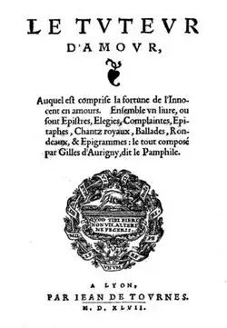 • Le Tuteur d'amour, auquel est comprise la fortune de l'Innocent en amour, composé par Gilles d'Aurigny dict le Pamphille. Ensemble un livre où sont epistres, elegies, complainctes, epitaphes, chants royaulx, ballades ou rondeaulx (1546), reprinted in Lyon 1547 [1], Paris 1553.