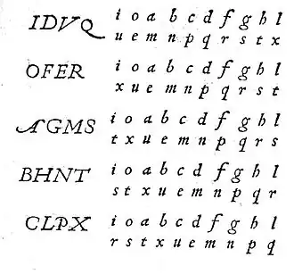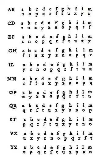 Bellaso's second booklet appeared in 1555 as a continuation of the first. The lower halves of the alphabets are now shifted regularly, but the alphabets and the index letters are mixed by means of a mnemonic key phrase, which can be different with each correspondent.