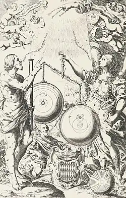 Frontispiece of Riccioli's 1651 New Almagest. Mythological figures observe the heavens with a telescope and weigh the heliocentric theory of Copernicus in a balance against his modified version of Tycho Brahe's geo-heliocentric system, in which the Sun, Moon, Jupiter, and Saturn orbit the Earth while Mercury, Venus, and Mars orbit the Sun. The old Ptolemaic geocentric theory lies discarded on the ground, made obsolete by the telescope's discoveries. These are illustrated at top and include phases of Venus and Mercury and a surface feature on Mars (left), moons of Jupiter, rings of Saturn, and features on the Moon (right). The balance tips in favor of Riccioli's "Tychonic" system.