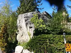 | "Granite" is a 6-by-7-by-4.5-foot (1.8 m × 2.1 m × 1.4 m), 30,000-pound (14,000 kg) granite boulder discovered "under a bunch of sticker bushes" during an October, 2015 construction project in Edmonds. After attempts to destroy the boulder resulted in destruction of the power equipment used, the city offered it for free to a city resident who would accept it on their property.[10][11] | |