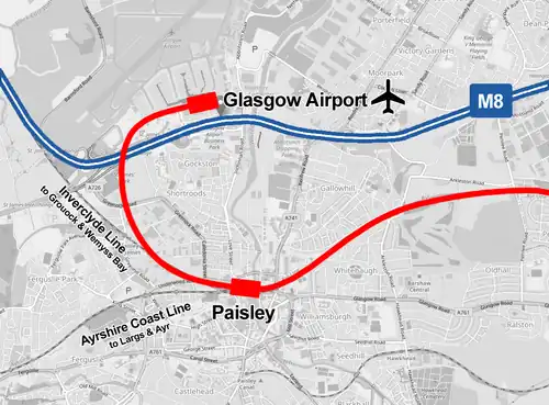 ![]() The 2006 planned route of GARL from Paisley to Glasgow Airport | |||||||||||||||||||||||||||||||||||||||||||||||||||||||||||||||||||||||||||