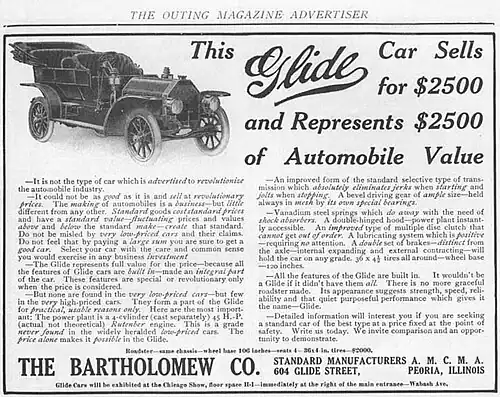 1909 advertisement for the Glide automobile manufactured in Peoria, Illinois, by the Bartholomew Company.