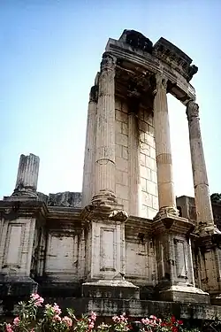 The aedes was the dwelling place of a god.[5] It was thus a structure that housed the deity's image, distinguished from the templum or sacred district.[6] Aedes is one of several Latin words that can be translated as "shrine" or "temple"; see also delubrum and fanum. For instance, the Temple of Vesta, as it is called in English, was in Latin an aedes.[7] See also the diminutive aedicula, a small shrine.