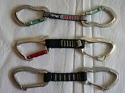 A quickdraw but made from a steel cable with steel carabiners that is permanently fixed to the bolt; longer wearing than aluminum quickdraws, and climbers do not need to retrieve them after a climb.[1]
