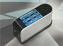The glossmeter provides a quantifiable way of measuring gloss intensity ensuring consistency of measurement by defining the precise illumination and viewing conditions.[6] The configuration of both illumination source and observation reception angles allows measurement over a small range of the overall reflection angle. The measurement results of a glossmeter are related to the amount of reflected light from a black glass standard with a defined refractive index. The ratio of reflected to incident light for the specimen, compared to the ratio for the gloss standard, is recorded as gloss units (GU).