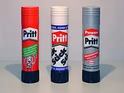In 1969, the German company Henkel invented the glue stick after studying the "twist-up ease" and convenience of lipstick applicators. The product was released under the Pritt Stick brand. By 1971 the Pritt Stick was being sold in 38 countries, and by 2001 in 121.[1] The first solvent-free, multipurpose glue stick that could be used for other materials (e.g. wood, glass and some plastics) was the "PowerPritt", which was put on the market in 2003.[2] There is also a "Pritt X", launched in 2010.