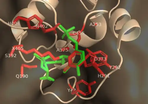 Catalytic activity is mediated by a short flexible loop at the dimer interface (residues 432–442 in GAD67, and 423–433 in GAD65). In GAD67 this loop remains tethered, covering the active site and providing a catalytic environment to sustain GABA production; its mobility in GAD65 promotes a side reaction that results in release of PLP, leading to autoinactivation.[12] The conformation of this loop is intimately linked to the C-terminal domain, which also affects the rate of autoinactivation.[13] Moreover, GABA-bound GAD65 is intrinsically more flexible and exists as an ensemble of states, thus providing more opportunities for autoantigenicity as seen in Type 1 diabetes.[14][15] GAD derived from Escherichia coli shows additional structural intricacies, including a pH-dependent conformational change. This behavior is defined by the presence of a triple helical bundle formed by the N-termini of the hexameric protein in acidic environments.[16]