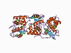 Glycoside hydrolase family 24 CAZY GH_24 comprises enzymes with only one known activity; lysozyme (EC 3.2.1.17). This family includes lambda phage lysozyme and Escherichia coli T4 phage endolysin.[8] Lysozyme helps to release mature phage particles from the cell wall by breaking down the peptidoglycan. The enzyme hydrolyses the 1,4-beta linkages between N-acetyl-D-glucosamine and N-acetylmuramic acid in peptidoglycan heteropolymers of prokaryotic cell walls. E. coli endolysin also functions in bacterial cell lysis and acts as a transglycosylase. The T4 lysozyme structure contains 2 domains, the interface between which forms the active-site cleft. The N-terminus of the 2 domains undergoes a 'hinge-bending' motion about an axis passing through the molecular waist.[8][9] This mobility is thought to be important in allowing access of substrates to the enzyme active site.