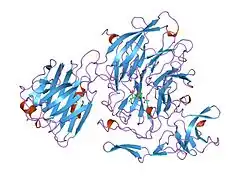 This family contains sialidases (CAZY GH_33), which hydrolyse alpha-(2->3)-, alpha-(2->6)-, alpha-(2->8)-glycosidic linkages of terminal sialic residues in oligosaccharides, glycoproteins, glycolipids, colominic acid and synthetic substrates. Sialidases may act as pathogenic factors in microbial infections.[8] The 1.8 A structure of trans-sialidase from leech (Macrobdella decora, Q27701) in complex with 2-deoxy-2, 3-didehydro-NeuAc was solved. The refined model comprising residues 81-769 has a catalytic beta-propeller domain, a N-terminal lectin-like domain and an irregular beta-stranded domain inserted into the catalytic domain.[9]