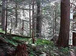 The Goat River and adjacent valleys are covered by predominantly coniferous forests, falling into four of British Columbia's biogeoclimatic zones. In the lower river valley, the wet interior cedar-hemlock zone dominates, with old-growth stands of large western red cedar present. The Engellmann spruce-subalpine fir zone covers much of the rest of the drainage. Deciduous stands are present along the river's edge. The dominant ground cover in the valley is devil's club.[1]