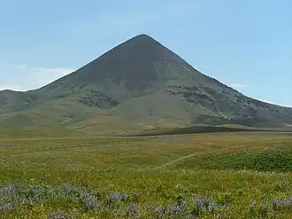 The Sweet Grass Hills are sacred to the Blackfoot and other tribes.[6] Mountain Chief, Calf Tail, and Bull Lodge experienced their respective vision quests on Gold Butte.[5] The ghost town of "Gold Butte" was a gold-mining camp located on the mountain's northwest slope after gold was discovered here in 1884.[7][8] The landform's toponym has been officially adopted by the United States Board on Geographic Names.[3]